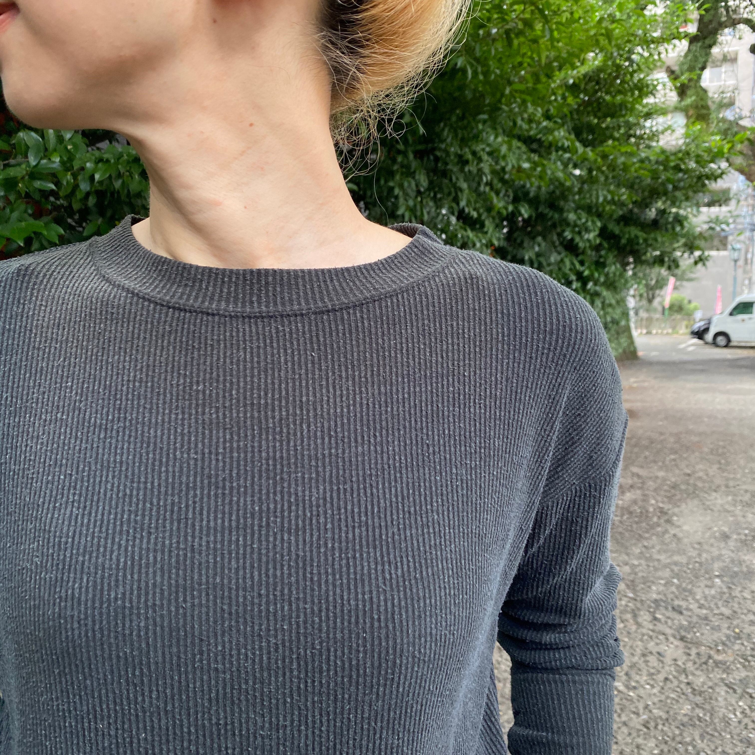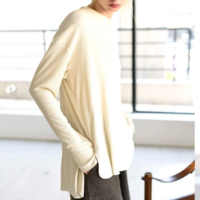 裾がラウンドしたクルーネックのロングスリーブTシャツ。