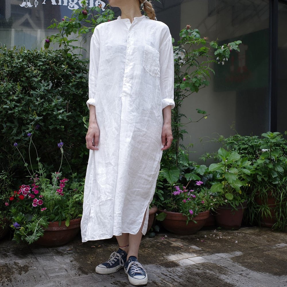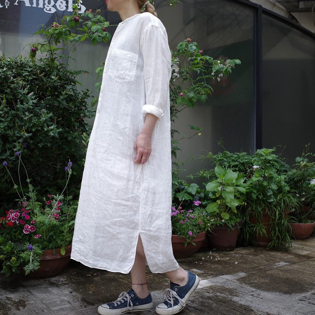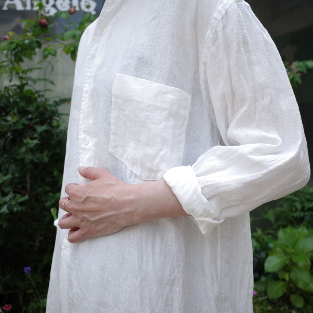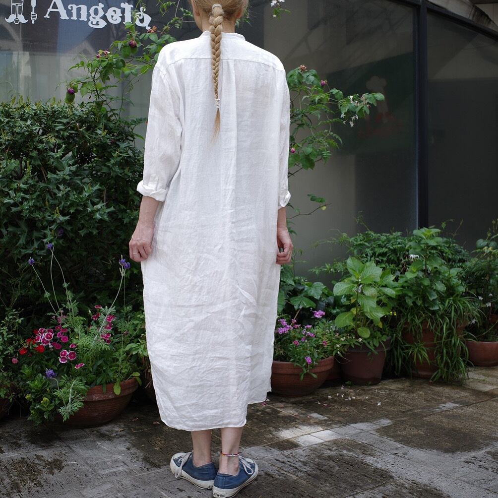 とてもしなやかな折柄の風合いがなんとも素敵なリネンWクロスに心は浮き立ち今までのアパレル人生の中でもこんなリネン素材には出会った事はありませんでした。そんな素敵なリネン素材のシャツワンピース、、あったら良いなぁ、、から別注企画で作って頂けました。特別なシャツワンピースに一生物のリネン素材となりますように。