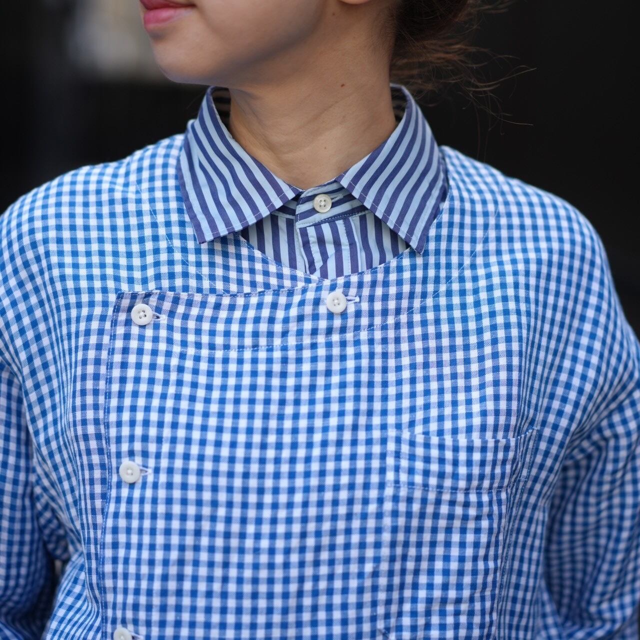 ts(s)ティーエスエスGingham Plaid Rayon Linen Cloth / Off-center Collarless Shirt Blue