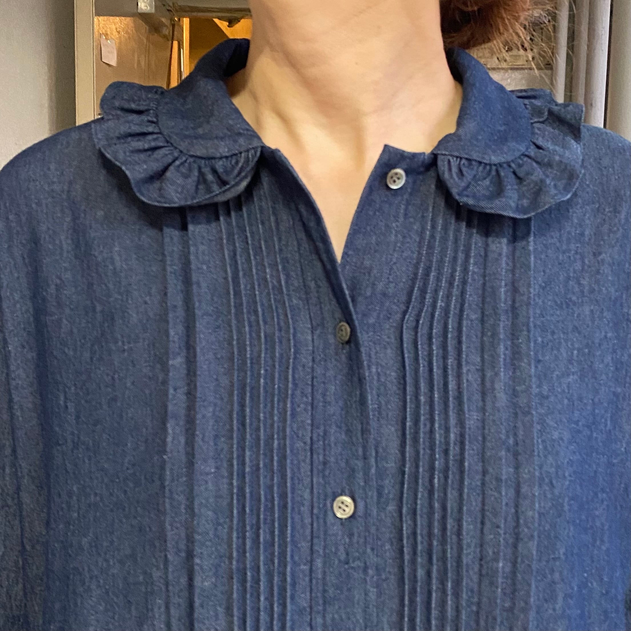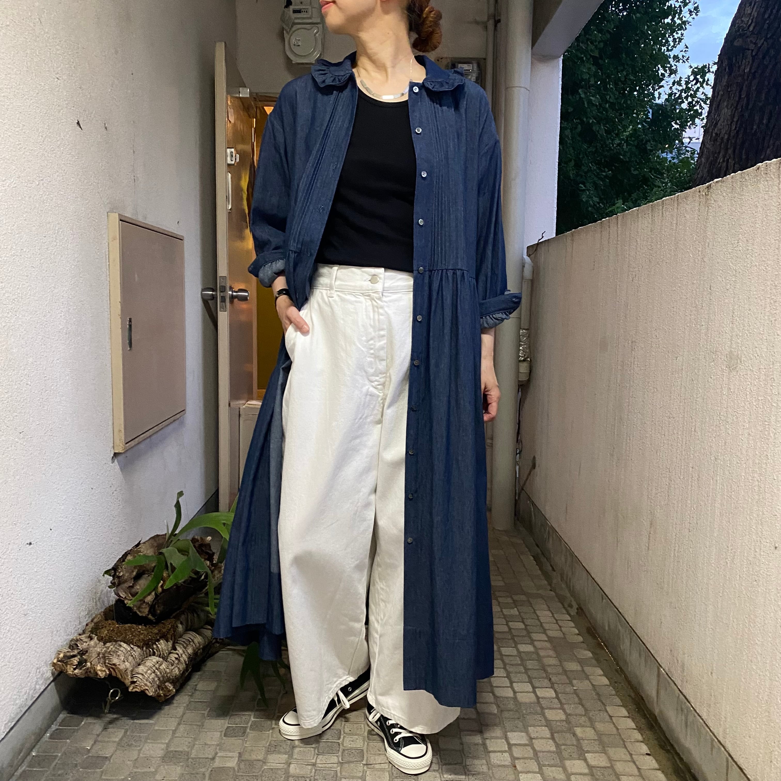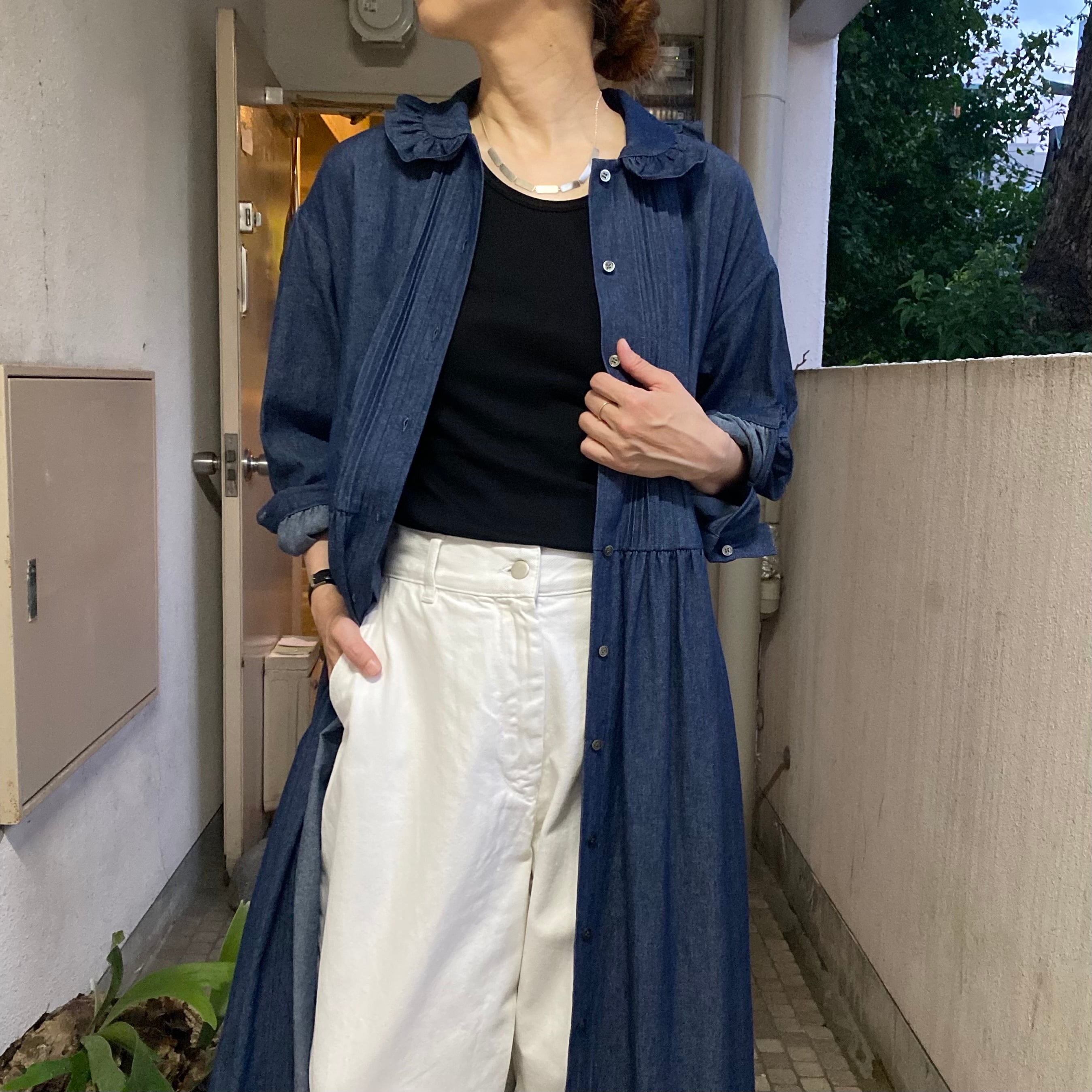 たくさんのギャザーと美しいタックのデニムドレス。フルボタンなので羽織りのコーディネートも楽しめます。ハイネックなどとのコーディネートも間違いないです。これだけ女性らしいデザインなのに反してデニム素材が新鮮。久しぶりにブーツと合わせたいワンピースです。